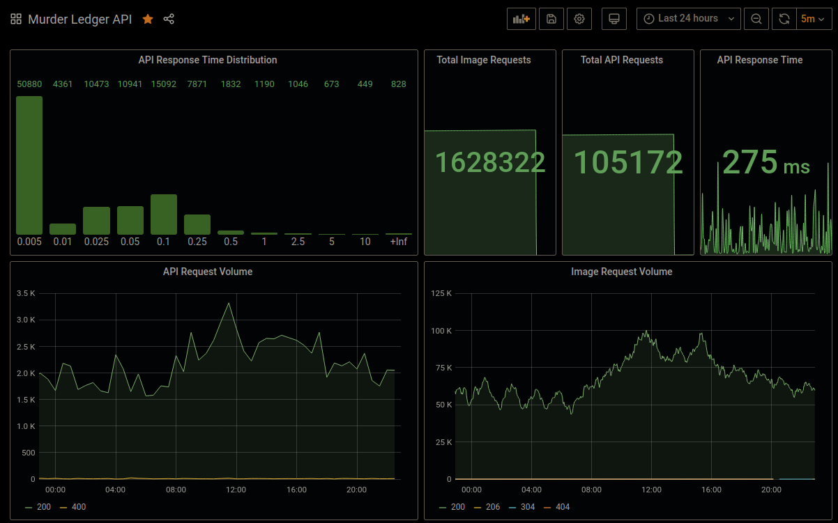 Now that the required data is in-place, it's possible to implement our own API endpoints to page through a players events or pull any kind of cool stats that we can dream up. The web API is a very straight-forward rest/json design. It uses a gin and a really nifty plugin called fizz which helps you generate an OpenAPI spec directly from the endpoint code. This was important to me, because even though I don't intend murderledger's API to be strictly versioned and managed as a public API, I do want other developers to be able to use the API to build cool things like twitch extensions or discord bots. Generating an OpenAPI spec allows other people to easily use the API without having to inspect my website to figure out what endpoints are available and how they work. You can browse the spec in Swagger Editor here: https://editor.swagger.io/?url=https://murderledger.com/api/openapi.json