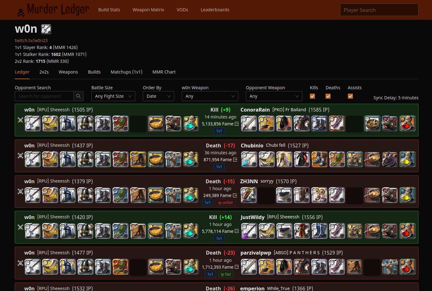 One of the most valuable features of murderledger turned out to be integration with twith.tv. On a whim, I decided to look into using the twitch API to see if we could essentially get clips of recent fights which were live streamed. The process involves manually linking a streamers twitch channel to their Albion player name. Then when we see an event for a player that has a linked twitch channel, we use the twitch API to check if they are live. If they are, and they have VODs enabled, then we can generate a link to the twitch video with a timestamp offset to right around the time the kill happened. This feature was a game changer. Murderledger lets players find videos of specific weapon matchups to see how other people play and how they can improve. It also helps content creators easily find the timestamps of specific fights in their VODs.